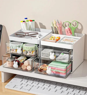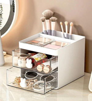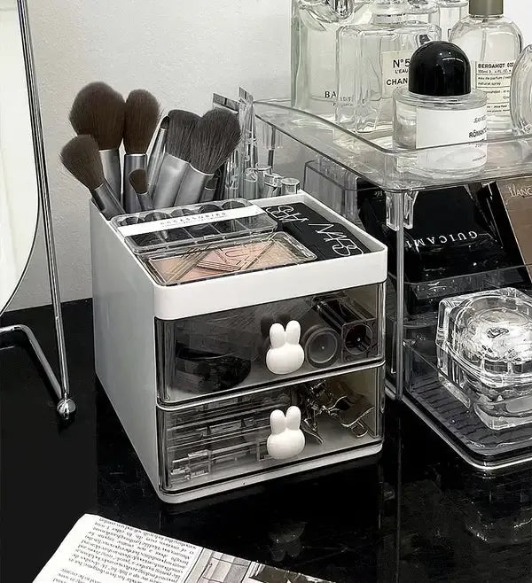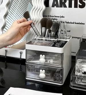 الوصف: منظم عملي ومميز لتخزين المكياج والأدوات الصغيرة. يتميز بأدراج شفافة مع مقابض لطيفة على شكل أرنب، مما يجعله مثاليًا للحفاظ على أدوات التجميل والإكسسوارات منظمة وسهلة الوصول. الجزء العلوي مصمم لتخزين الفرش ومستحضرات التجميل المختلفة. يناسب تمامًا على طاولة المكياج أو المكتب، حيث يمكن استخدامه أيضًا لتنظيم الأدوات المكتبية. تصميم أنيق ومناسب لجميع أنواع الديكورات.
