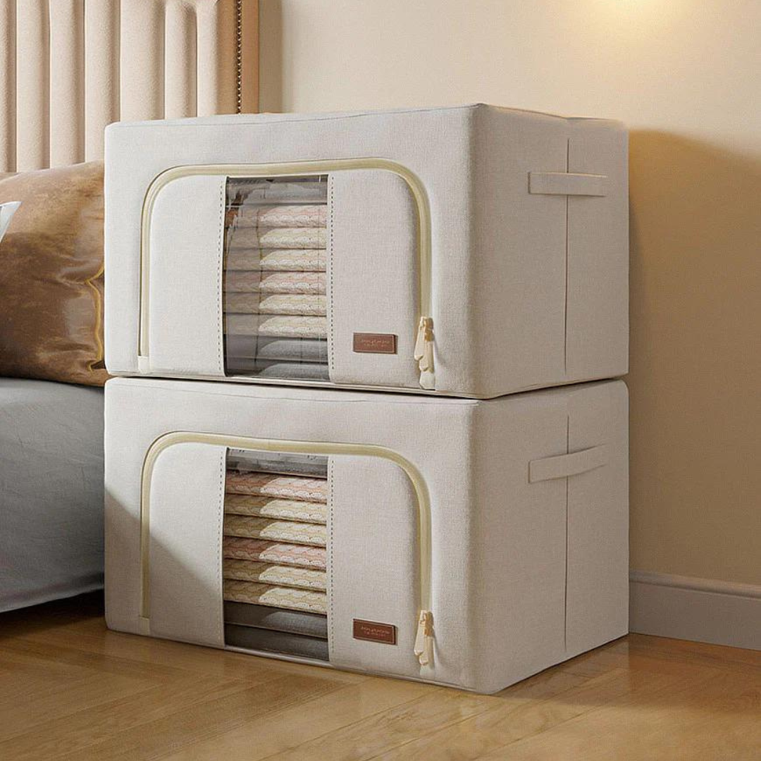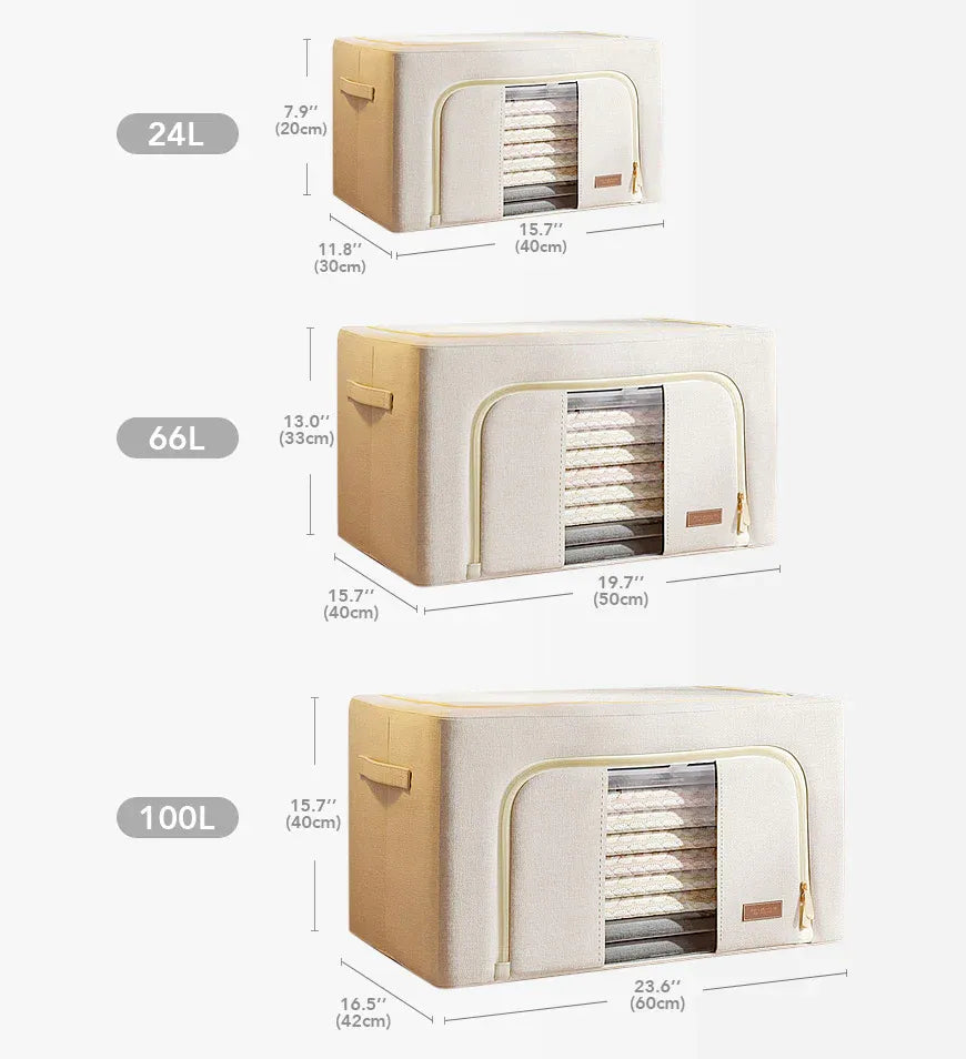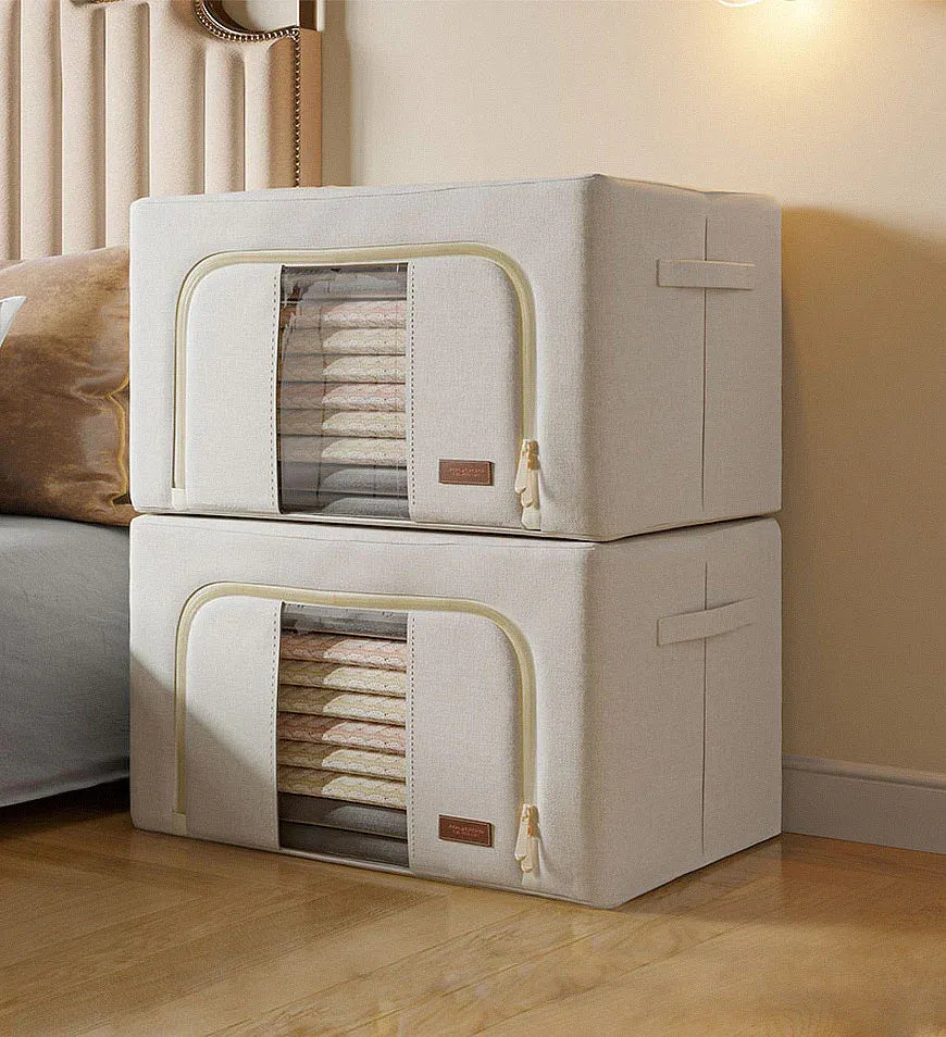 تم تصميم هذه الصناديق بأقمشة مقاومة للغبار والرطوبة مع واجهة شفافة تسمح لك برؤية محتويات الصندوق بسهولة. كما تحتوي على سحّابات عالية الجودة لسهولة الفتح والإغلاق، ومقابض جانبية لسهولة الحمل والتحريك.